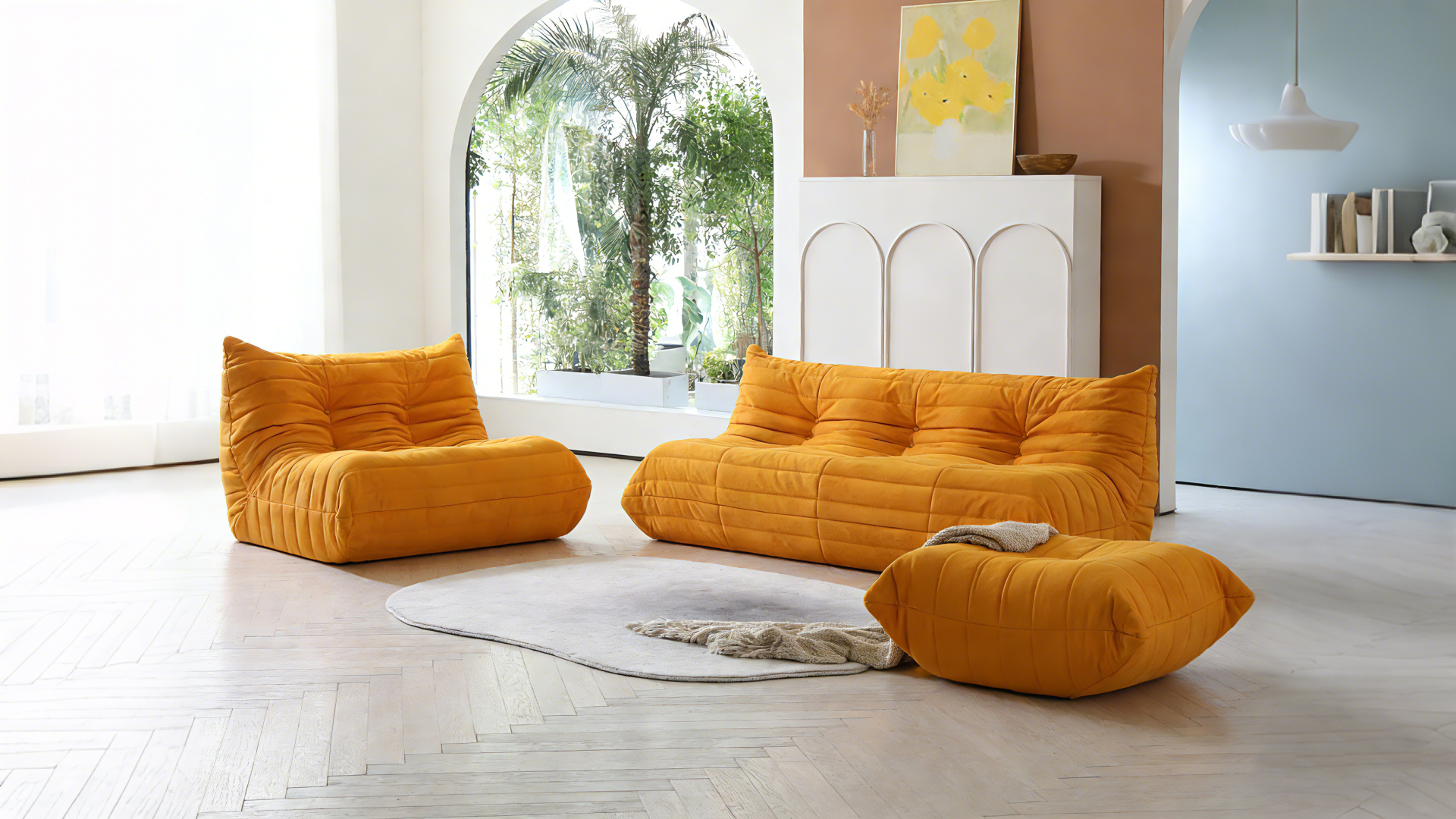 Le tissu est un velours jaune gingembre, orné de matelassages verticaux, ce qui lui donne un aspect fourni, semblable à celui d'une chenille.